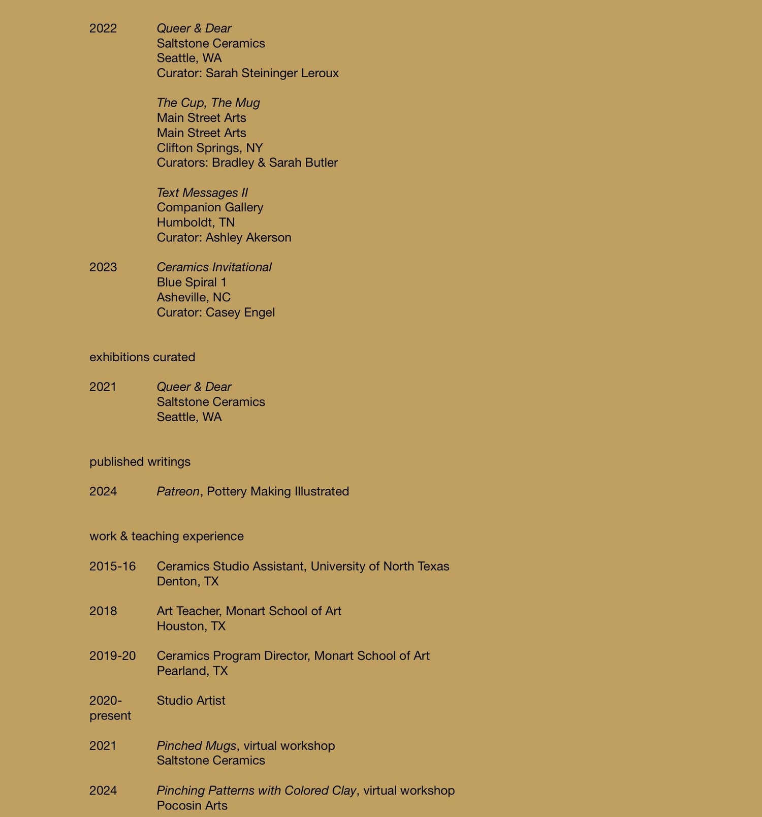 I am, first and foremost, inspired by the earth—the touch of a river rock, the color of the grass, the pattern in the flowers. Feeling the pull toward nature through the clay itself, I strive to create work that reflects the beauty, simplicity, and imperfection of the trees, sticks, and leaves. I create patterns using nerikomi techniques, then push, pull, and stretch them through the pinching process. The excitement of my work lies in laying out intricate patterns and allowing them to transform into something new and distinct—relinquishing control through the movement of the form.